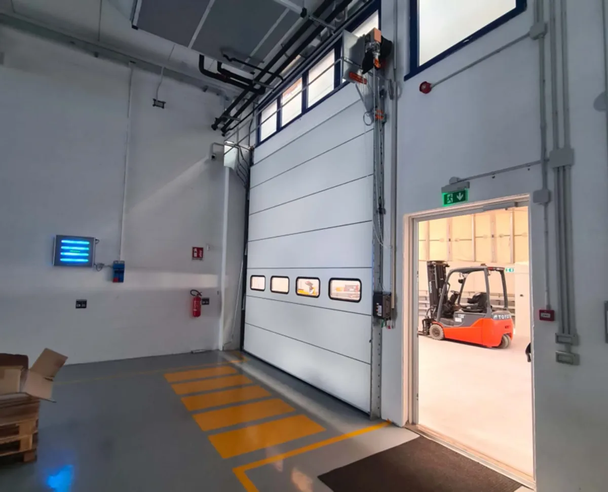 I portoni sezionali sono ideali per edifici industriali di piccole e medie dimensioni, specialmente in aree di carico e passaggio mezzi, dove è essenziale ottimizzare lo spazio disponibile.